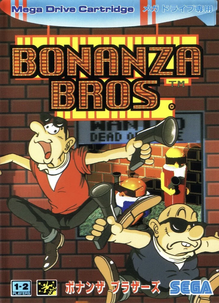 Bonanza Bros. is a side-scrolling shoot-em-up videogame developed by Sega and released in 1990 for the Arcades, and later the Sega Mega Drive/Genesis, and home computers. The game is about stealing various treasures (as they are called in the game) from various locations with a time limit of 3 minutes.