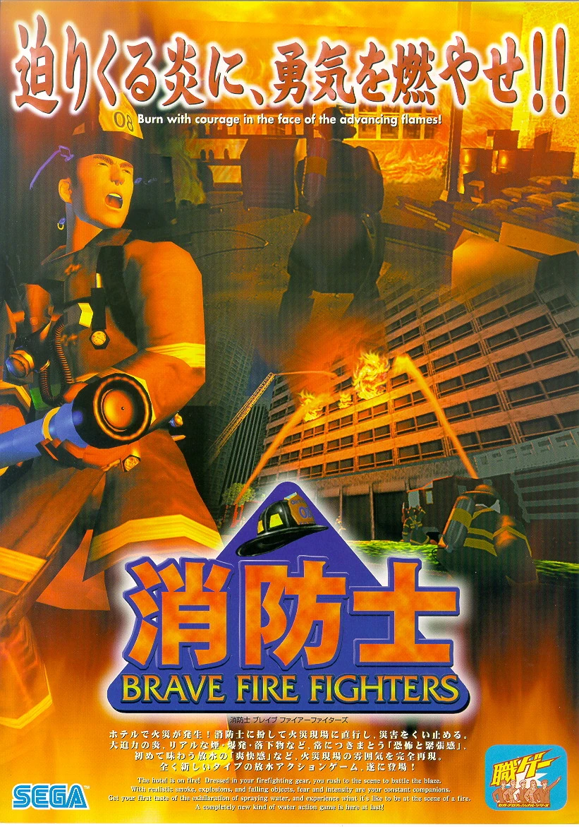 Brave Firefighters (消防士 BRAVE FIRE FIGHTERS Shouboushi Brave Fire Fighters) is an arcade game by Sega, released in 1999. It is about firefighters fighting a huge fire breaking out after an electrical overload at the Whitehead Hotel, where a mayor election campaign is underway. The game uses a novelty hose controller to put out the flames.