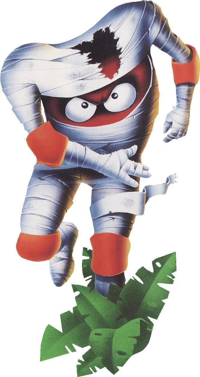 Chuck is a large broad shouldered red mummy like monster creature with his face located in his torso. Most of the time his true face is covered by bandages apart from his eyes, but during certain attacks his large toothy mouth can be seen.