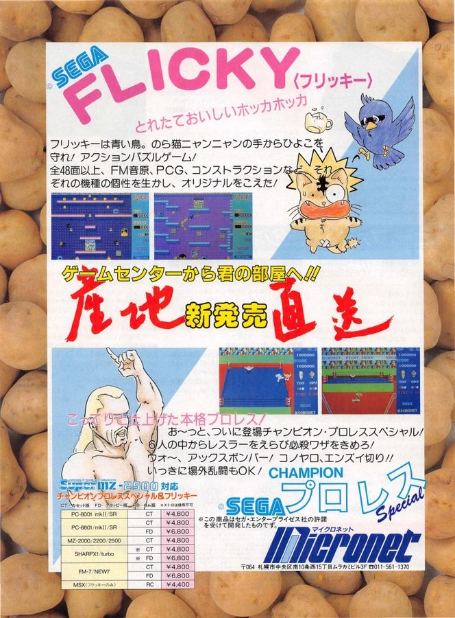 Print ad for Micronet’s Japanese home computer versions of Flicky. Taken from the January 1986 issue of Oh! MZ magazine.