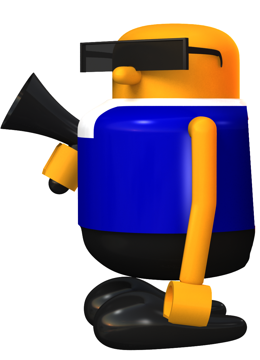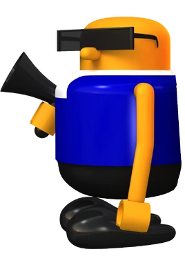 Mobo is short and squat with orange skin. His hands are shaped like that of a LEGO minifigure, being a smooth clamp like shape. His face is mostly featureless apart from a nose that holds his rectangular sunglasses up. HIs body has a plastic like quality to it. He wears a blue sleeveless shirt, with what appears to be a white cravat, black pants and shoes. Like all characters in the Bonanza Bros. series, he lacks any legs, meaning his body floats above his feet. He is rarely seen without his megaphone shaped gun.