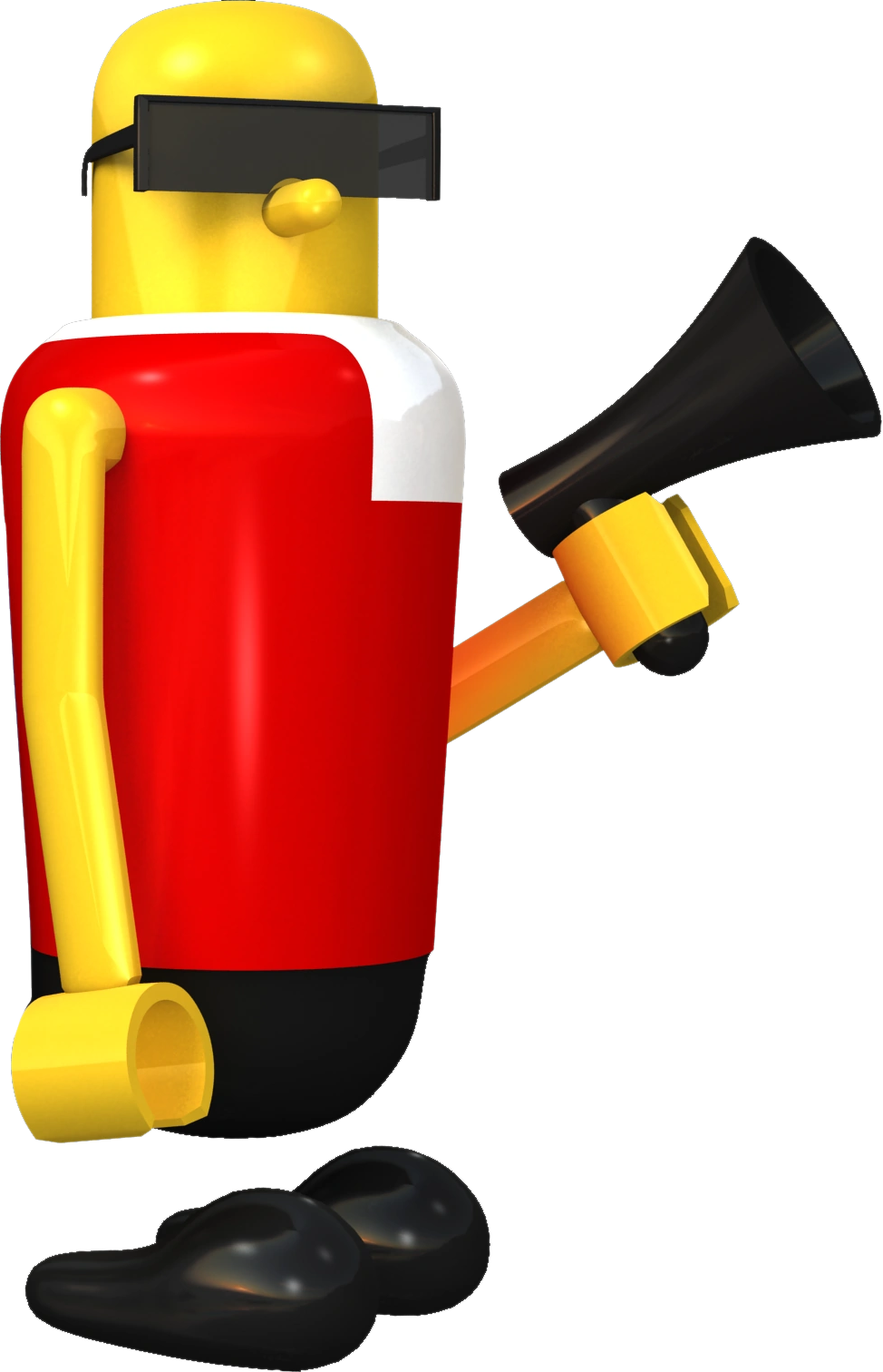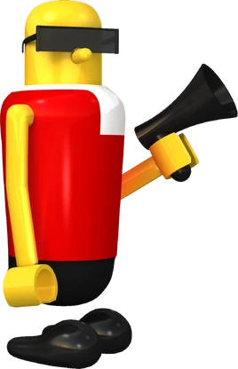 Robo is tall and thin with yellow skin. His hands are shaped like that of a LEGO minifigure, being a smooth clamp like shape. His face is mostly featureless apart from a nose that holds his rectangular sunglasses up. HIs body has a plastic like quality to it. He wears a red sleeveless shirt, with what appears to be a white cravat, black pants and shoes. Like all characters in the Bonanza Bros. series, he lacks any legs, meaning his body floats above his feet. He is rarely seen without his megaphone shaped gun.