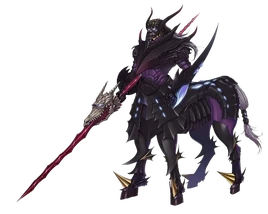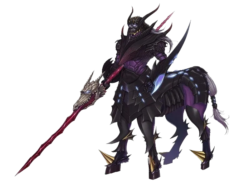 Sleipnir is a centaur knight raised from the dead. His body is clad in a black sharp skeletal and draconic armour, with the helmet resembling a black horned skull. His eyes glow with a ghostly white, his entire body an etherial purple hue aside from the silver dead hair upon the back of his head and his horse tail. He carries with him a twisted magenta lance with a dragon skull as the hilt. Upon each of his four horseshoes he wears a golden spike pointing directly upwards.